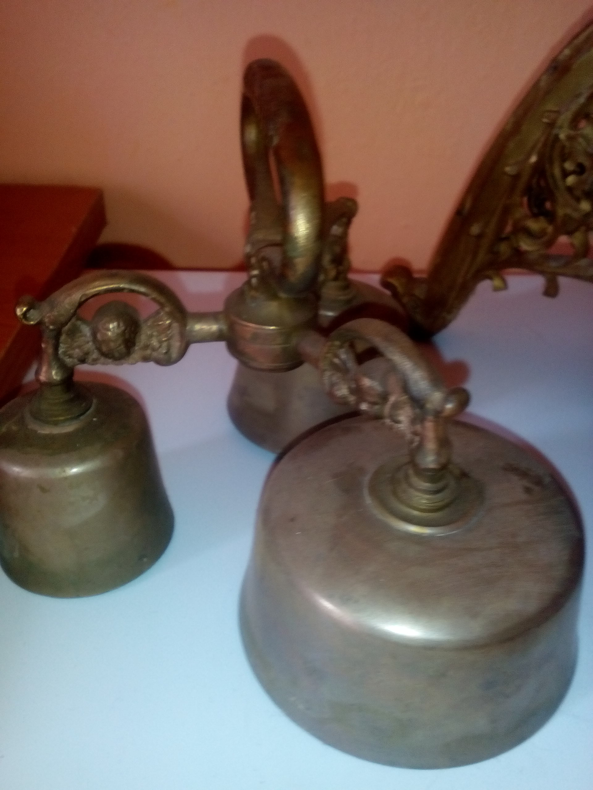 Prodám starožitné 3 spojené mešní zvonce /Otec, Syn a Duch svatý/,kostelní svícen výška 60 cm, mosaz, ornamenty a další drobné věci na chalupu např. zouvák na boty. Viz. foto